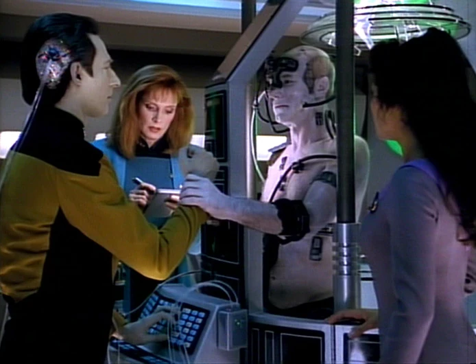 with no effort). The second stage is equally unrewarding, but the final link hits the jackpot: as both systems run a little wild, Data links into the Borg consciousness, where he mentions his discoveries: although the Borg have subcommands relative to the three main functions (defense, communication and navigation), they all have root commands. As he's about to go into details, though, Locutus revives, knocks out a security guard, and almost deactivates the link, until Data grapples with him and rips off the tool-portion of his right-hand prosthetic.